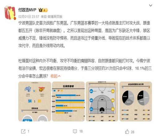 赛后付政浩认为广东输球的关键是缺乏大中锋,禁区的威慑力不足,锋线上没有防守悍将,进攻过于依赖外线,导致现在的战术体系是以攻代守,而且是外线带动内线。
